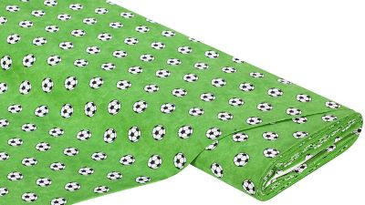 Baumwollstoff Fußball Design mit All-over-Fußball-Druck, in besonders weicher, feinfädiger Qualität. Machen Sie Ihren Liebsten eine Freude mit kleinen Accessoires, Taschen, Rucksäcke oder Deko für´s Kinderzimmer! Motiv Größe: 2 cm Ø, Farbe: grüngrundig, Breite: 160 cm, Gewicht: ca. 140 g/m². Material: 100 % Baumwolle.