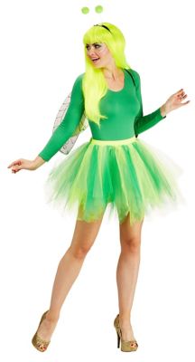 - Besonderheiten: Tutu mit fetzigen Tüll-Streifen in Neongrün und -gelb, abnehmbarer Schwanz, glitzernde Flügel, Haarreif mit Fühlern
