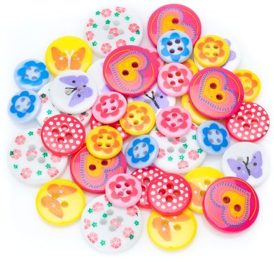 buttinette Knöpfe "Frühling", Farbe: bunt, Größe: 12–19 mm Ø, Inhalt: 40 Stück (8 verschiedene Designs à 5 Stück). Material: Kunststoff.