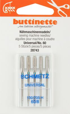 buttinette Nähmaschinennadeln "Universal" in Flachkolben-Ausführung, für verschiedene Stoffqualitäten. Stärke: 60, Inhalt: 5 Stück. Material: Stahl.