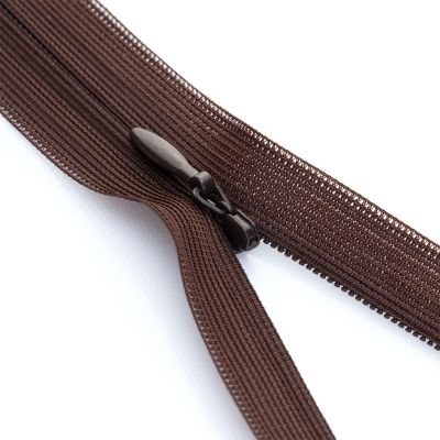 buttinette nahtverdeckter Reißverschluss, nicht teilbar, Farbe: braun, Breite: 4,2 mm, Band 25 mm. Material: Band aus 100 % Polyester, Spirale aus Kunststoff, Schieber aus Metall.