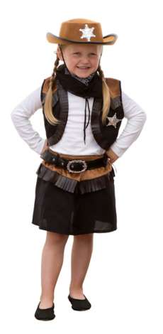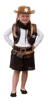 Cowgirl Kostüm für Kinder aus Polyester-Gewebe, Kurzhaar-Plüsch und Lederimitat, bestehend aus Rock und Weste, Rock mit Reißverschluss, Gummibund und Gürtel, mit Fransen und Sheriff-Stern-Brosche, Farbe: schwarz/braun. Material: 100 % Polyester.