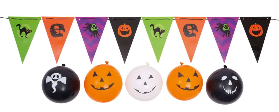 Deko-Set "Halloween" – denn Deko kann man auf einer Halloween-Party nicht genug haben! Arrangieren Sie Wimpelkette und Luftballons je nach Lust und Laune!