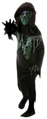 - Besonderheiten: Maske mit LED-Leuchtaugen zum An- und Ausschalten, Robe mit Knochen-Aufdruck, Maske mit Horrorgesicht-Aufdruck
