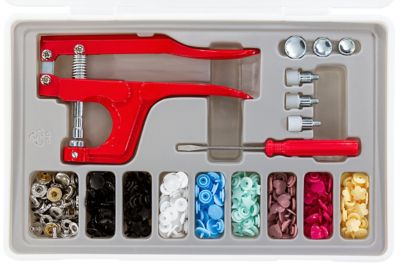 Kleiber Druckknopf-Set mit Zange, zum einfachen Anbringen von Druckknöpfen an verschiedenen Materialien, Inhalt: 1 Zange, 4 Stempelplatten, 3 Druckstempel, 1 Stanzeinsatz, 1 Schraubenzieher, 120 Druckknöpfe aus Kunststoff (Ø 12 mm), 20 Druckknöpfe aus Metall (Ø 12 mm), Aufbewahrungsbox aus Kunststoff (28,5 x 18 x 3,5 cm) sowie Anleitung.