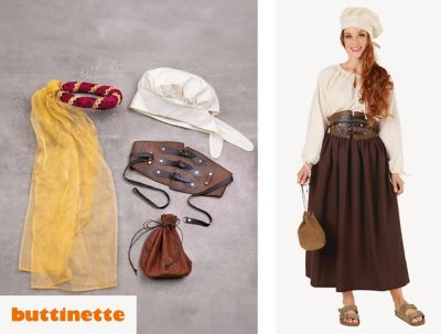 Nähanleitung "Set: Mittelalter Frau", exklusiv von buttinette, je eine Anleitung für einen Taillengürtel, eine Kopfhaube, ein Beuteltäschchen, einen Burgfräuleinkranz inkl. Schnittmuster, Größe kann individuell angepasst werden je nach Kopf- bzw. Taillenumfang, Schwierigkeitsstufe 2/3, Stoffempfehlung: Lederimitat, Webstoffe, Pannesamt, Organza.