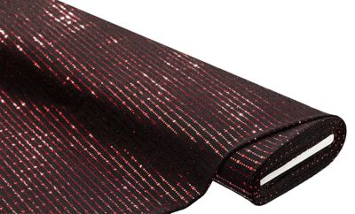 Paillettenstoff "Streifen", Farbe: schwarz/rot, querelastisch, Streifen querverlaufend, Streifenbreite Kreis: 3 mm Ø, Breite: 150 cm, Gewicht: ca. 180 g/m². Material: 100 % Polyester.