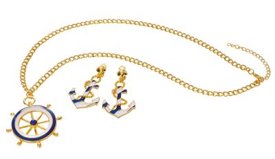 Jede modebewusste Matrosin weiß: Ein Kostüm ohne Schmuck sieht nur halb so gut aus. Wie gut, dass in dem Schmuckset Marine alles enthalten ist, um das Matrosinnen-Kostüm perfekt abzurunden – eine Halskette mit Steuerrad und süße Anker-Ohrringe. Damit sind Sie bereit für einen rauschenden Karneval. Also legen Sie sich den maritimen Schmuck an und segeln Sie los zur Partyinsel. Ahoi!