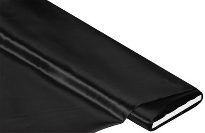 Schwer entflammbarer Satin, Farbe: schwarz, weich fließend und edel glänzend, Breite: 150 cm, Gewicht: ca. 100 g/m². Schwer entflammbar nach DIN 4102 - B1. Material: 100 % Polyester.
