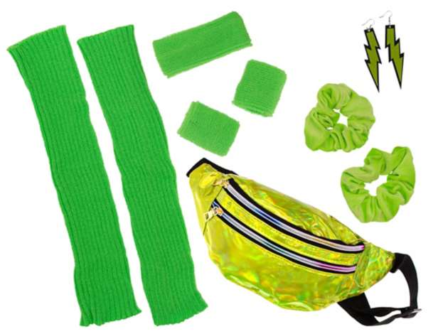 Ob zu Fasching und Karneval oder zu Mottopartys – dank dieses Sets mit 80er-Accesoires in schrillem Neongrün gewinnen Sie sicher den best-dressed-Award auf der Bad-Taste-Party. Das Set kommt mit allem, was das 80er-Herz begehrt: Stulpen, Scrunchies, Schweißbänder, Stirnband, Holo-Bauchtasche und Blitz-Ohrringe peppen Ihr 80er-Jahre-Kostüm so richtig auf, damit Sie energiegeladen die Tanzfläche stürmen können – let’s get physical!