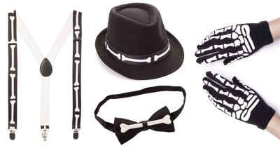 An Halloween treiben Sie Ihr Unwesen – schaurige Skelette, die den Leuten Angst und Schrecken einjagen. Mit dem Skelett-Set werden auch Sie im Handumdrehen zur Spukgestalt – allerdings ganz und gar nicht furchteinflößend gekleidet, sondern vielmehr als schicker Skelett-Gentleman. Mit Ihren Skelett-Hosenträgern, Skelett-Handschuhen, dem Skelett-Zylinder und der Skelett-Fliege, werden Sie auch die Damen spielend leicht beeindrucken können. Fordern Sie Ihre Favoritin doch zum Tanz auf und klappern Sie zusammen auf der Tanzfläche um die Wette.