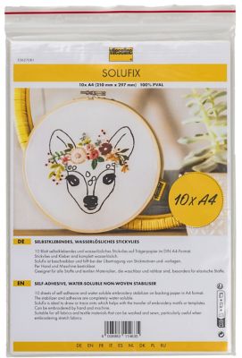 Das bewährte Vlieseline Solufix gibt es jetzt auch im praktischen DIN A4-Zuschnitt! Sie brauchen ein Vlies für Ihre Stickarbeiten, das nach dem Sticken verschwindet? Oder Sie möchten Applikationen aufnähen und dafür den Stoff vorübergehend stabilisieren? Dann ist Vlieseline Solufix das Richtige für Sie! Es wird auf den Stoff geklebt und kann nach dem Sticken bzw. Applizieren einfach ausgewaschen werden – kaltes Wasser genügt!