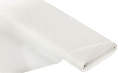 Weiches Aufbügel-Vlies, Farbe: weiß, einseitig aufbügelbar, Stärke: 0,4 mm, Breite: 90 cm, Gewicht: ca. 47 g/m². Material: 80 % Polyamid, 20 % Polyester.