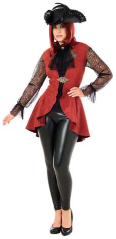Wer sagt denn, dass Schätze immer aus Gold, Silber und Edelsteinen bestehen müssen? Diesen schicken Damenfrack haben Sie auf Ihrem letzten Raubzug erbeutet, und er steht Ihnen einfach fabelhaft! Das Schößchen in leicht gerüschter Optik und die reich verzierte Schnalle der Piratenweste wirken elegant und dank der Schnürung am Rücken ist ein figurschmeichelnder Sitz garantiert. Gleich bestellen und auf Ihr nächstes Piratenabenteuer freuen!